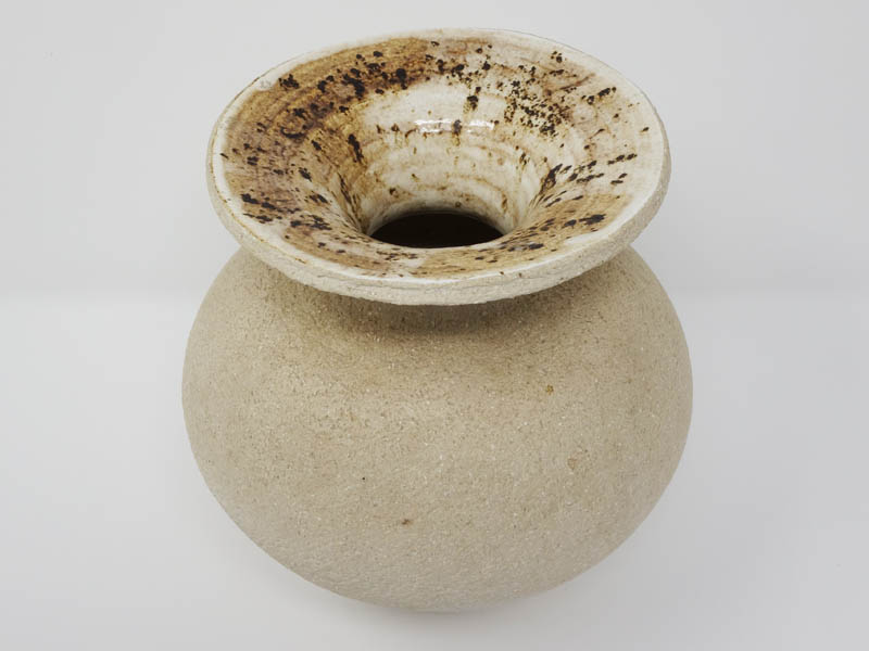 Stoneware,swollen neck, rough textured finish with interior speckled glaze.