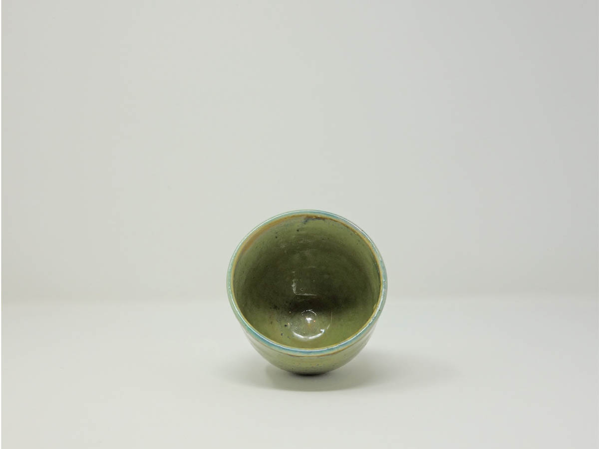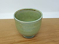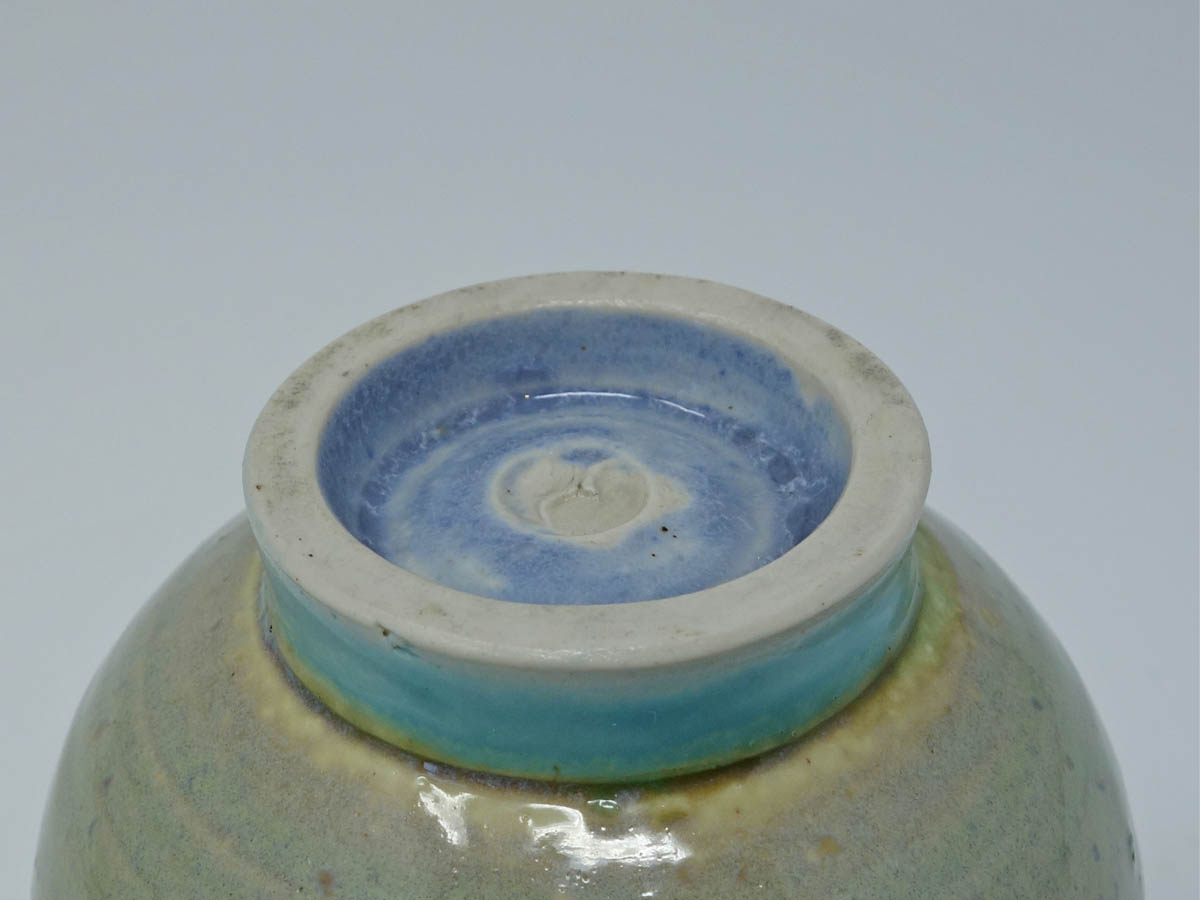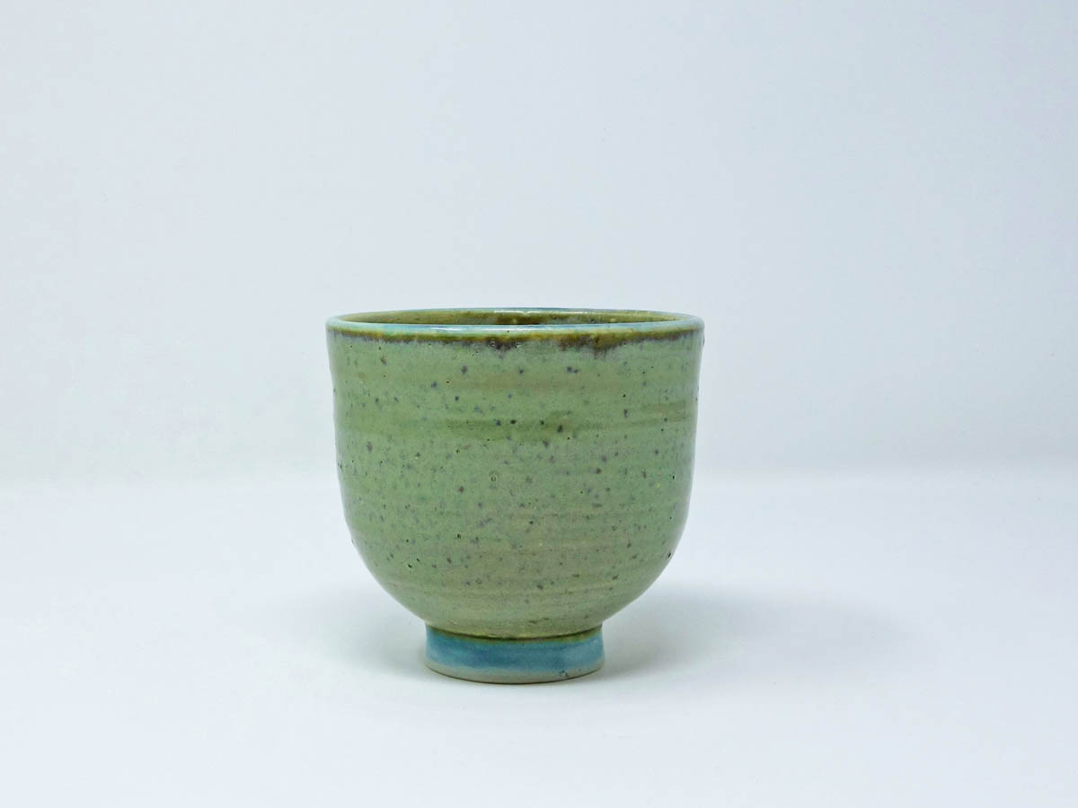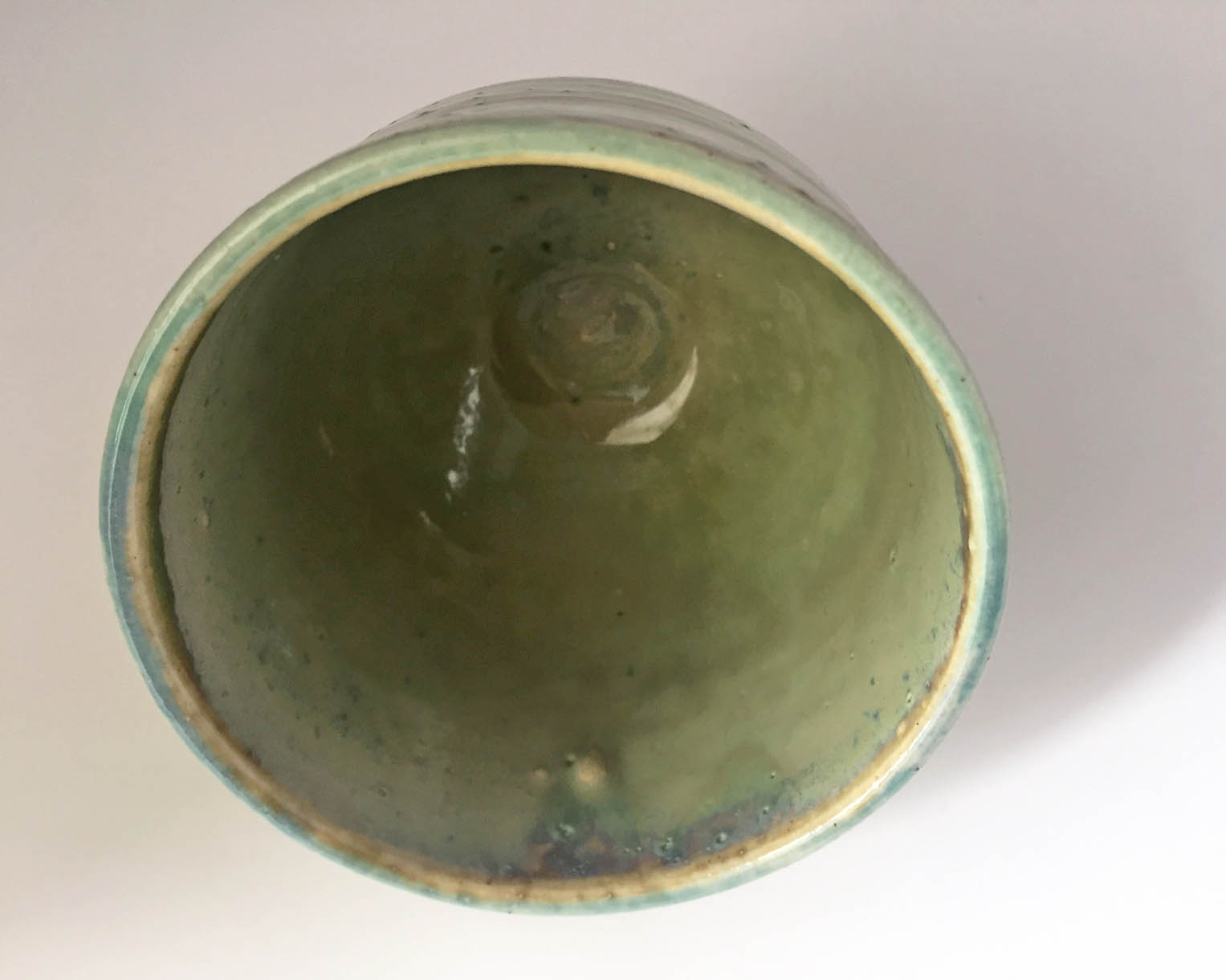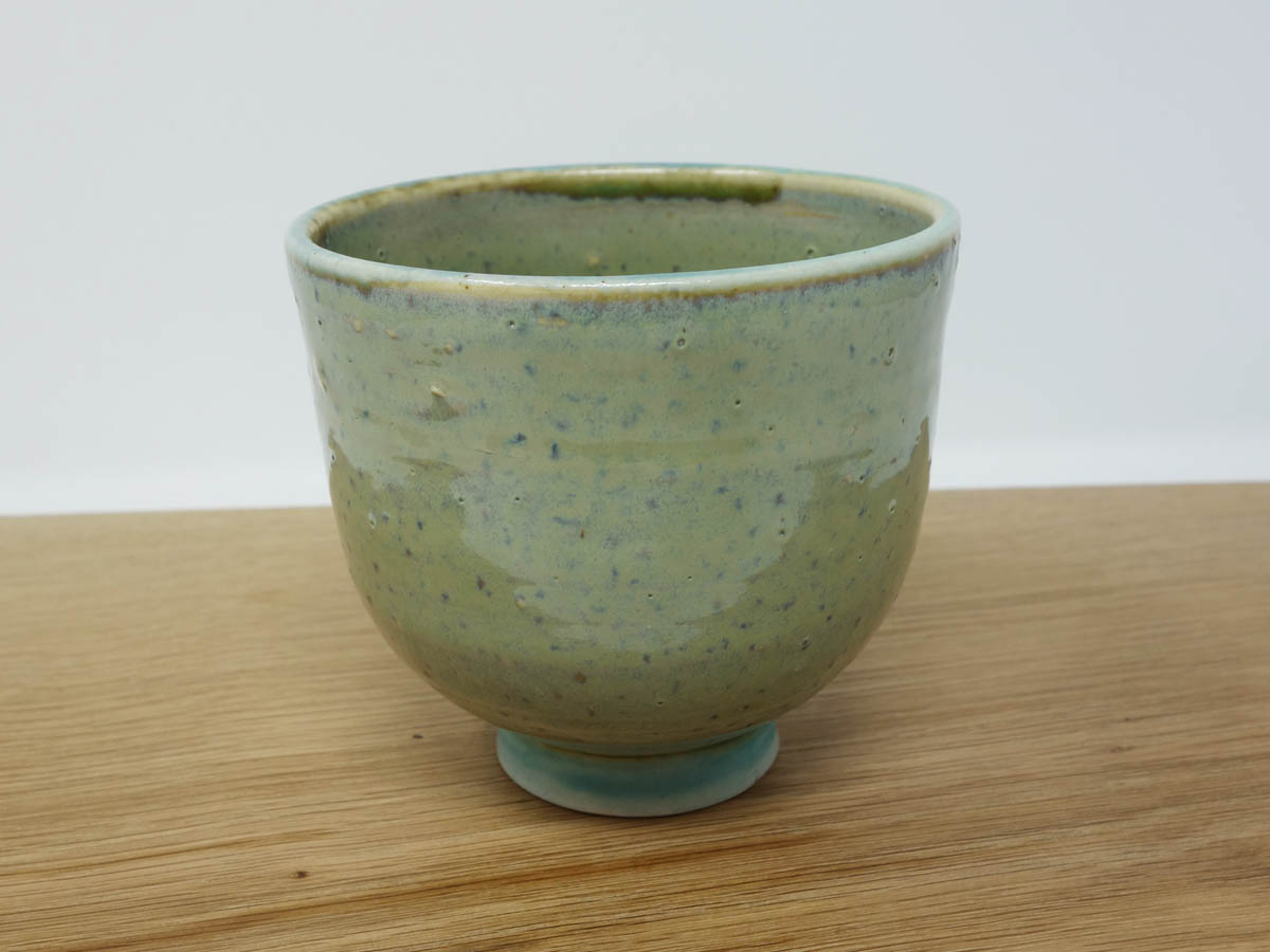 Porcelain with pale green glaze over speckled soft blue surface. Thin turquoise band to rim and turquoise foot. Potter's seal