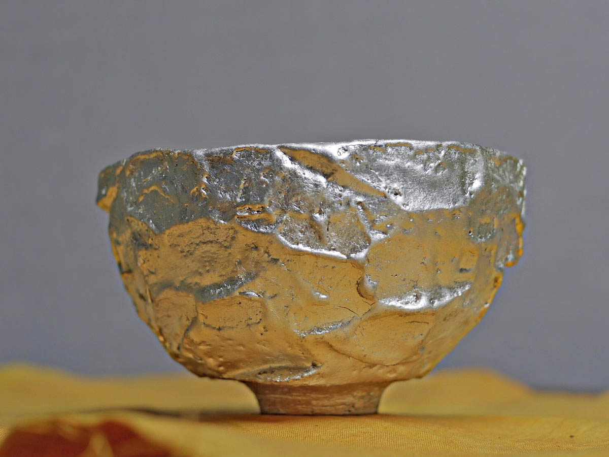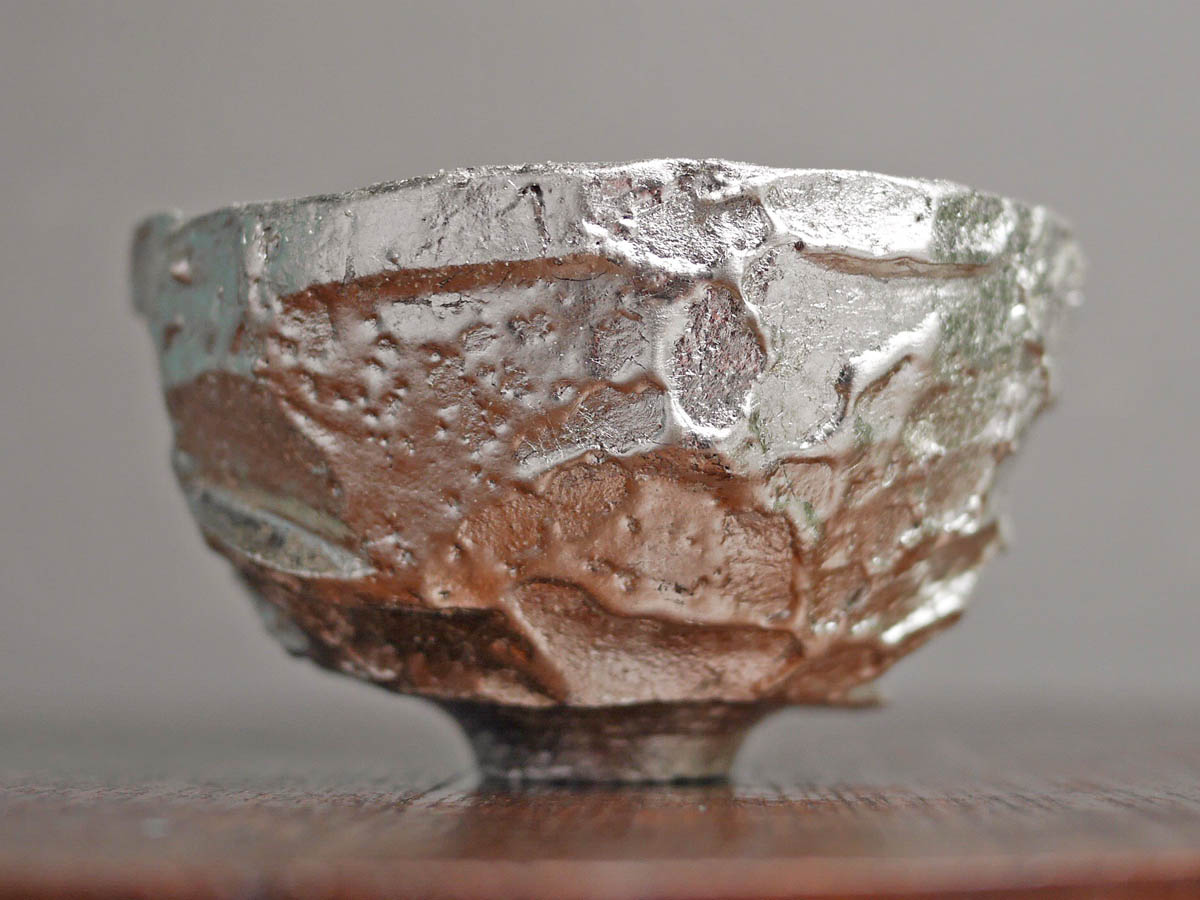 The entire tea bowl has been covered in white gold to create a glowing effect from afar and up close looks like flowing metal on a rough metal surface.